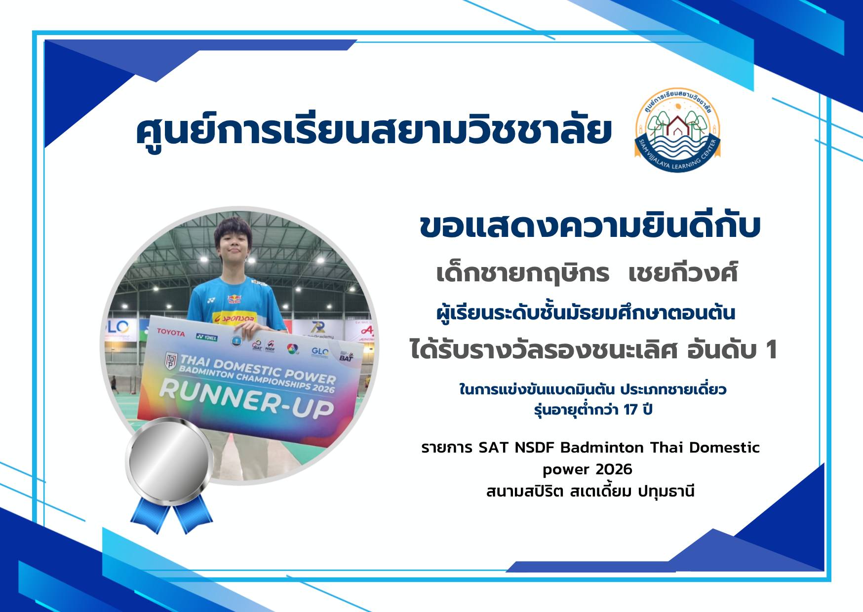 ศูนย์การเรียนสยามวิชชาลัย ขอแสดงความยินดีกับเด็กชายกฤษิกร เชยกีวงศ์และ เด็กชายนวพล มุกดารัศมี ที่ได้รับรางวัลในการแข่งขันแบดมินตัน รายการ SAT NSDF Badminton Thai Domestic power 2026 ภาค 1 ภาคตะวันออก ณ สนามสปิริต สเตเดี้ยม ปทุมธานี